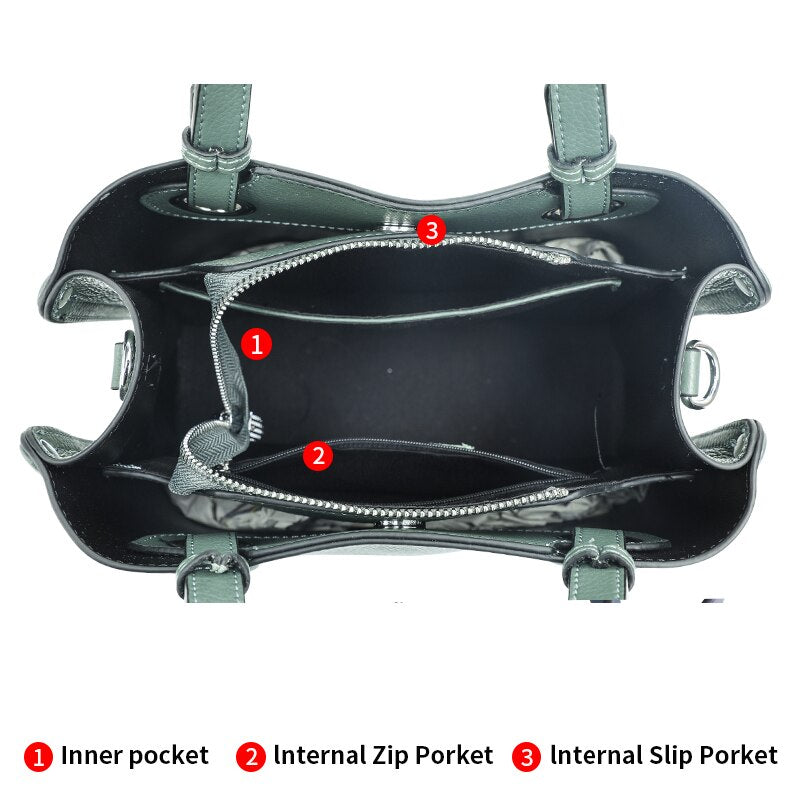 - Sangle détachable : Le sac est livré avec une longue sangle détachable, vous permettant de le transporter comme un sac à bandoulière pour un confort mains libres, ou comme un sac à main seau pour un look plus formel.